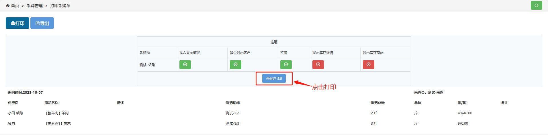 登录后台—采购管理—按需采购—点击打印采购单(可根据时间选择采购单)