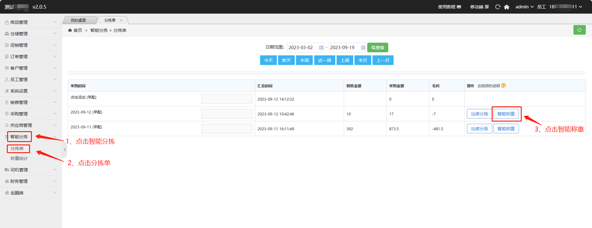 登录后台—智能分拣—点击分拣单—点击智能称重