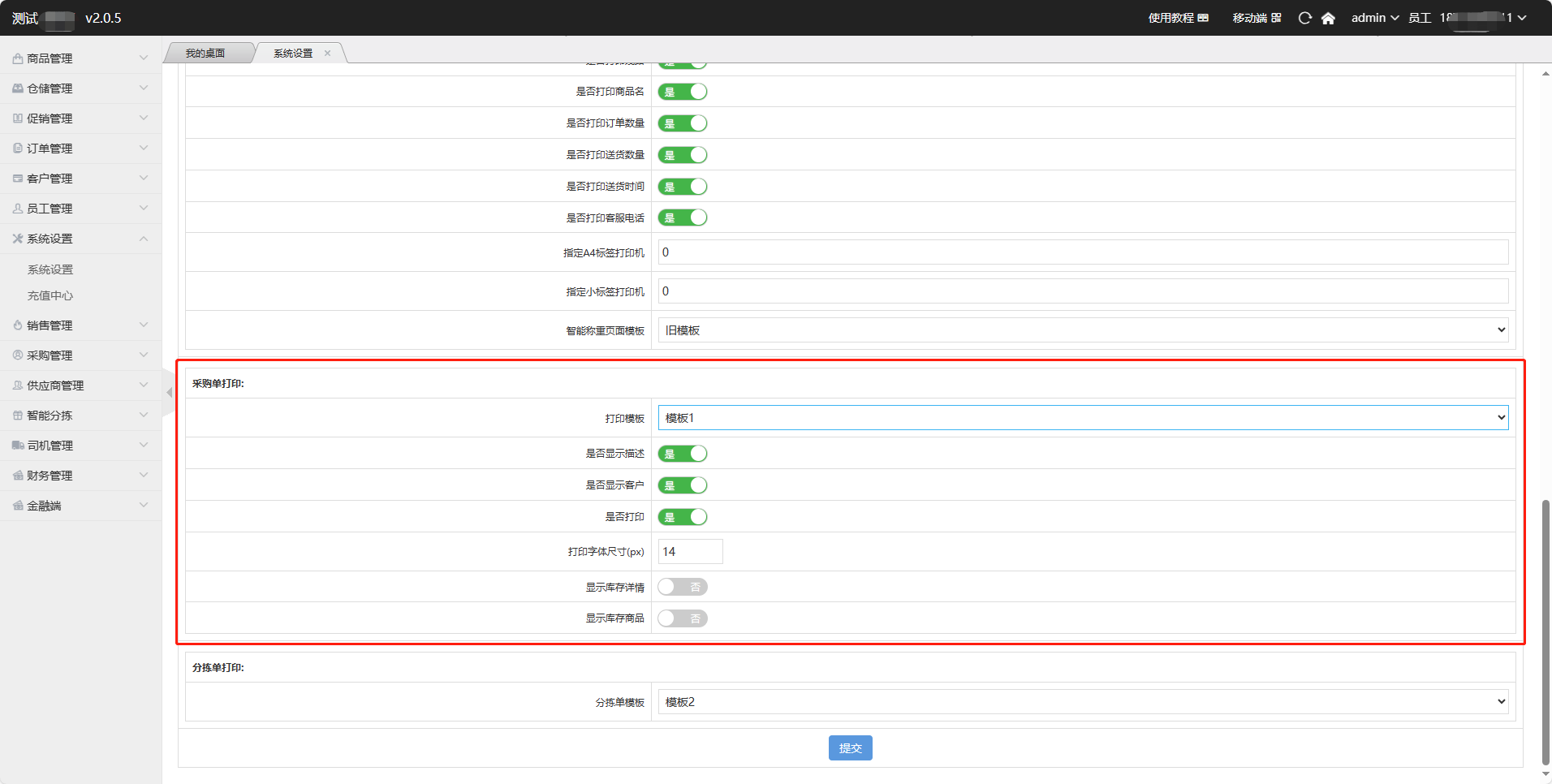是否开起溯源—是否显示商品名—是否显示商店名—是否显示商品描述—是否显示商品单位—是否显示采购员—是否显示商品分类—是否显示供应商—是否显示发货时间—是否显示销售员—是否显示司机—是否显示配送点—是否显示分拣员—是否显示生产日期—是否显示下单数量—是否显送货数量—是否显收货地址—提交